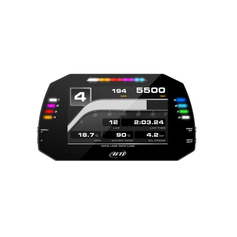 - High contrast 7″ TFT display: The AiM MXG 1.2 display features a high contrast 7″ TFT display, fully configurable by a dedicated software. An ambient light sensor keeps the back light at optimum brightness levels.