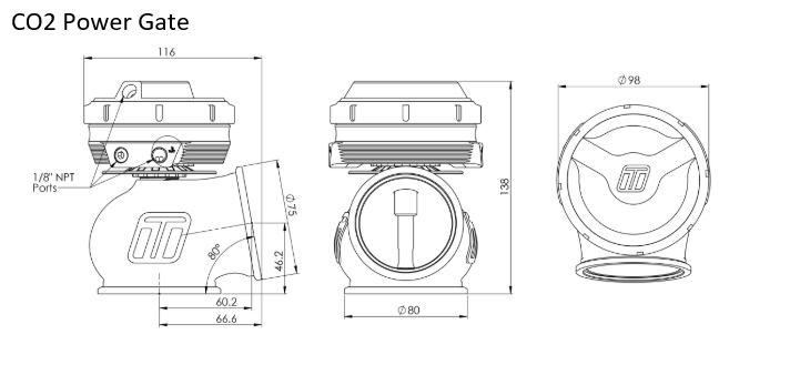 CO2 Power Gate – high performing 60mm external wastegate designed for control strategies that actively bias the top chamber with high pressure for large boost bandwidth operation, such as CO2 drag racing, or compressed air WRC applications