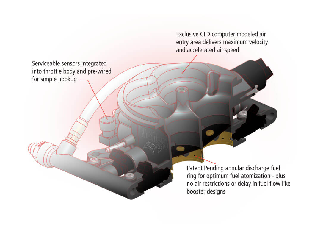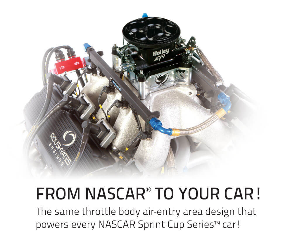 • 950 CFM Throttle Body with CFD computer designed air-entry area taken from Holley’s famous NASCAR® throttle body – as found on all NASCAR Sprint Cup Series™ cars
