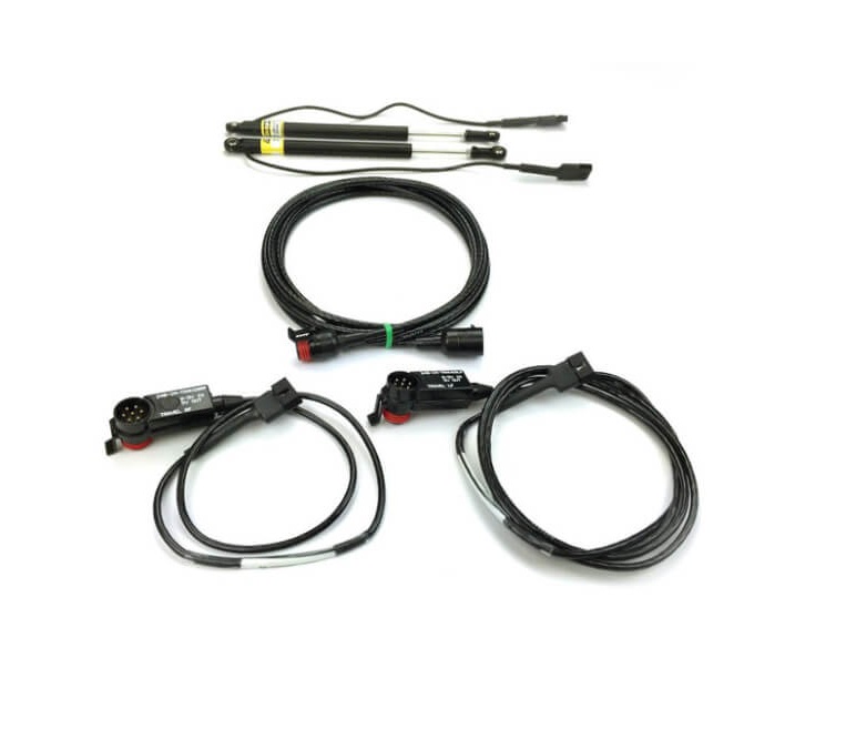 The front shock travel sensor kit contains: (2) 4″ linear shock travel sensors, (2) signal conditioning modules and (1) analog extension cable.
