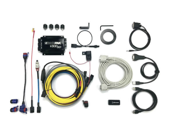 The affordable V300SD data recorder is the most common recorder for Pro Stock, Pro Modified and many other Sportsman classes. In its base configuration, the V300 monitors six parameters (engine RPM, driveshaft RPM, accel G, lateral G, battery volts), but it can be expanded to monitor up to 67 channels of data to meet the needs of most users. Any monitored function can also be displayed in real time on Racepak’s IQ3 or UDX dashes. Datalink Standard software is pre-installed, giving the user the ability to record, download and perform telemetry (real-time) sessions, plus add math channels, custom run log pages and video integration.