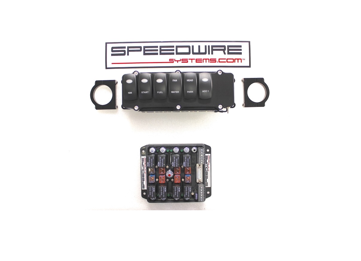 Speedwire 8 Relay Controller and data cable with switch panel. This is Speedwire’s lightest, smallest relay controller, measuring 4.5 by 5 inches. Don’t let this small package fool you—it has all the capability and power needed, used in many applications, including some of the world’s fastest pro mod cars. This controller can be adapted for any application and can be configured to work with your needs. cars. Speedwire’s new switch panels are CNC machined out of billet aluminium and anodized black.